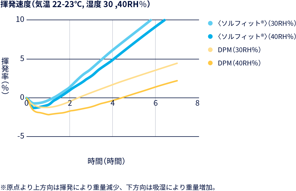 吸湿が少なく揮発速度とパターンが理想的であり、ソルフィットは揮発速度に対しての湿度の影響が小さく安定した香調を得られます。